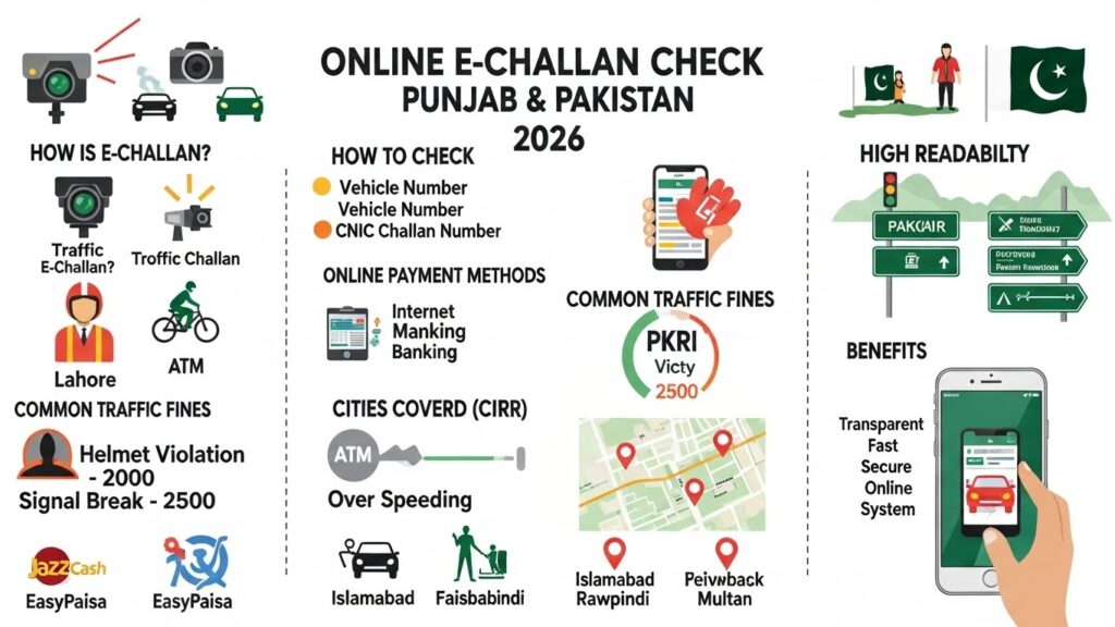 This complete guide explains how to check E-Challan online in Punjab & Pakistan, payment methods, fines list, and frequently asked questions.